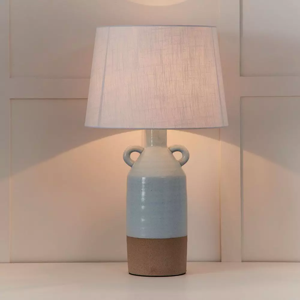 It’s no secret that lighting can make or break the ambiance of a room. A strategically placed lamp or two can bring warmth to any space. This attractive terracotta and pale blue lamp with a white shade will brighten any room.
