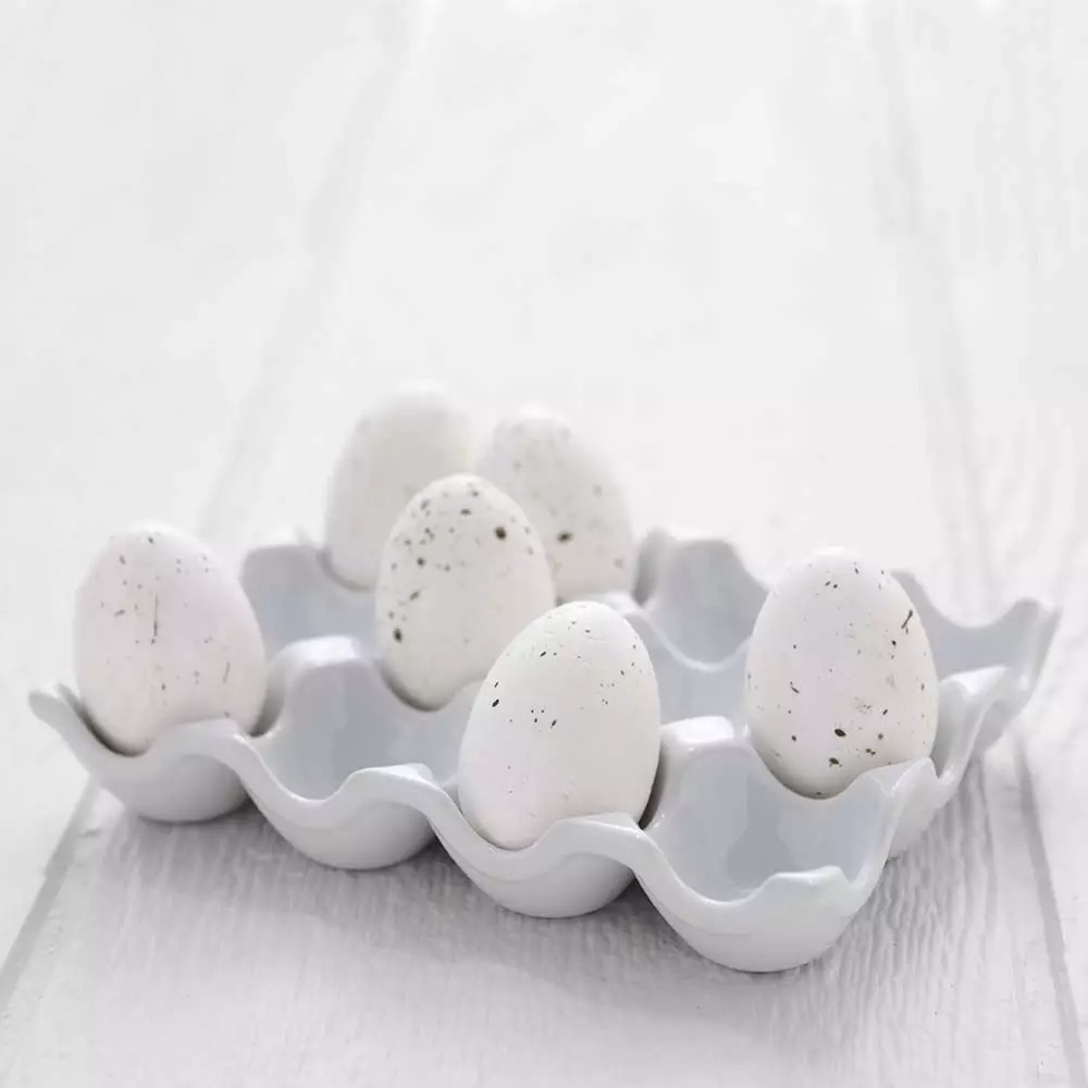 A classic white porcelain egg carton is a great way to display your eggs.