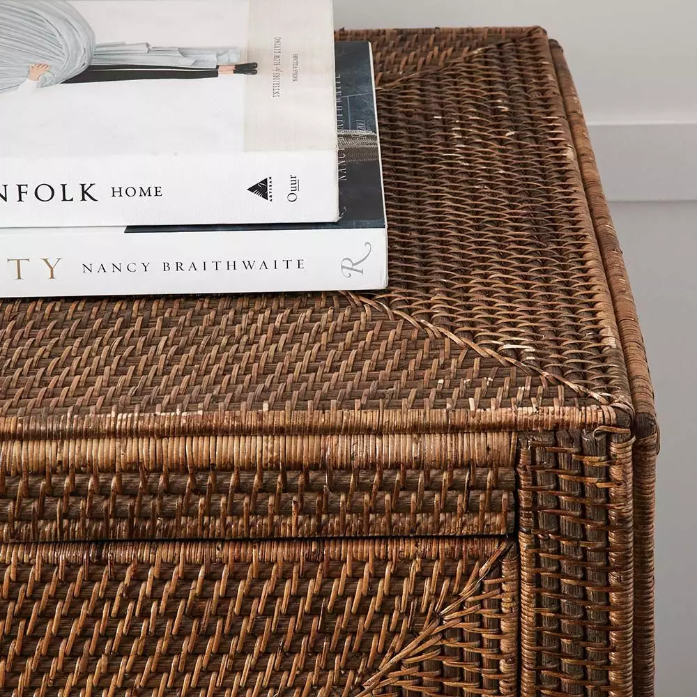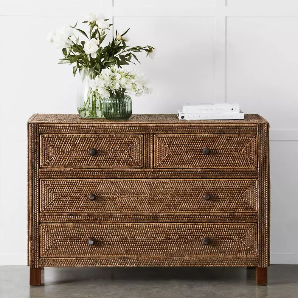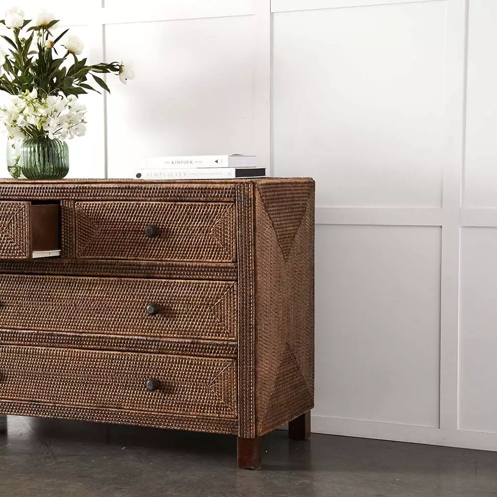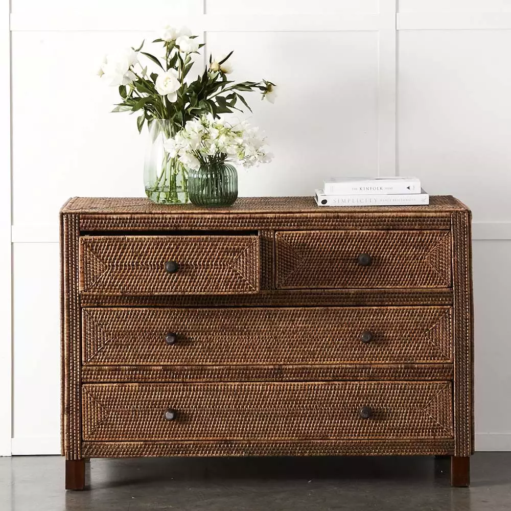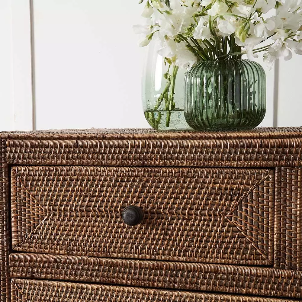 The Boracay chest will look equally at home in the living room, the bedroom or a hallway and translates well in coastal, city or country residences. Crafted with a sturdy mahogany frame and decorated with an intricate woven pattern of peel antique (small size rattan peel) with laminated plywood drawer inners. The four handy drawers keep things close at hand but out of sight.