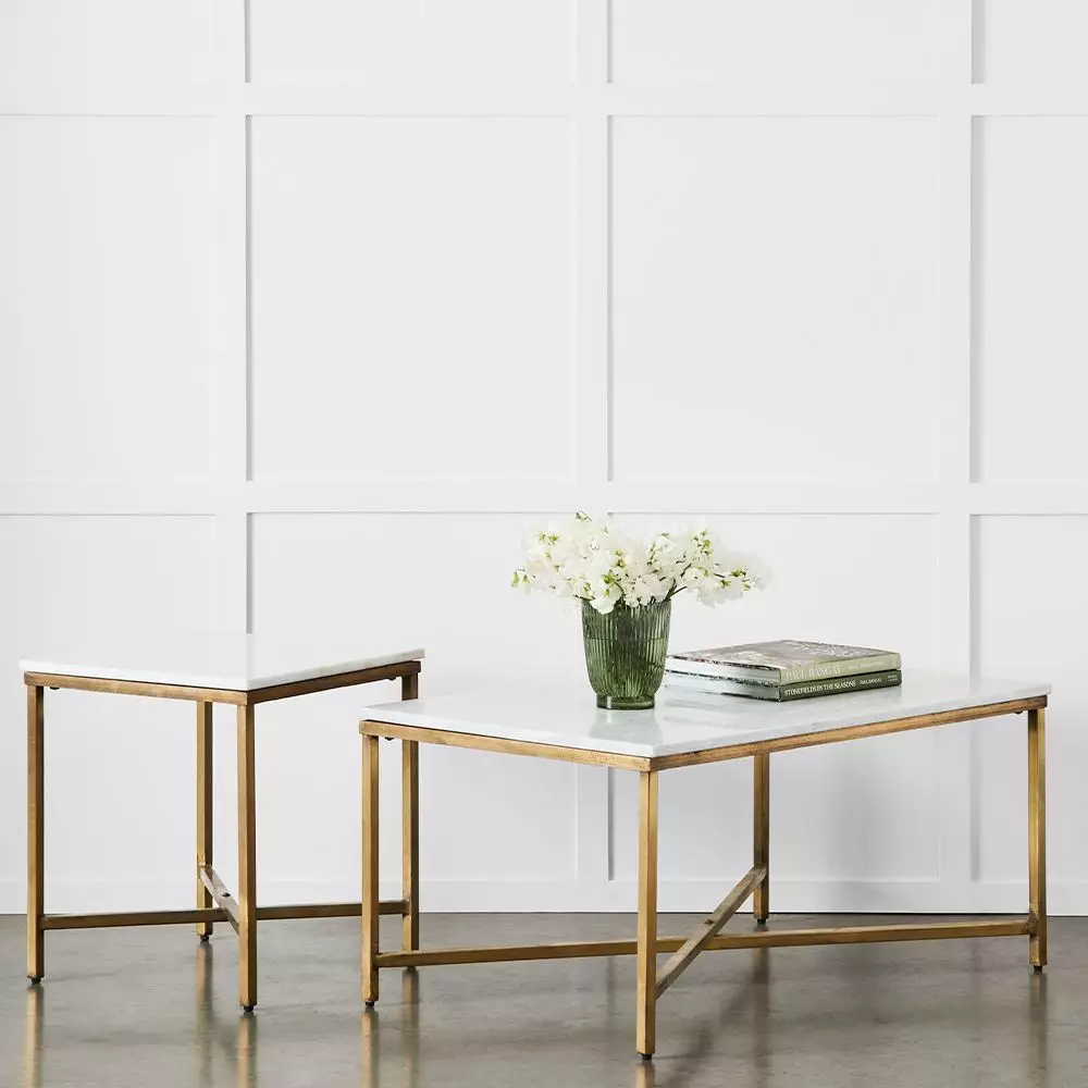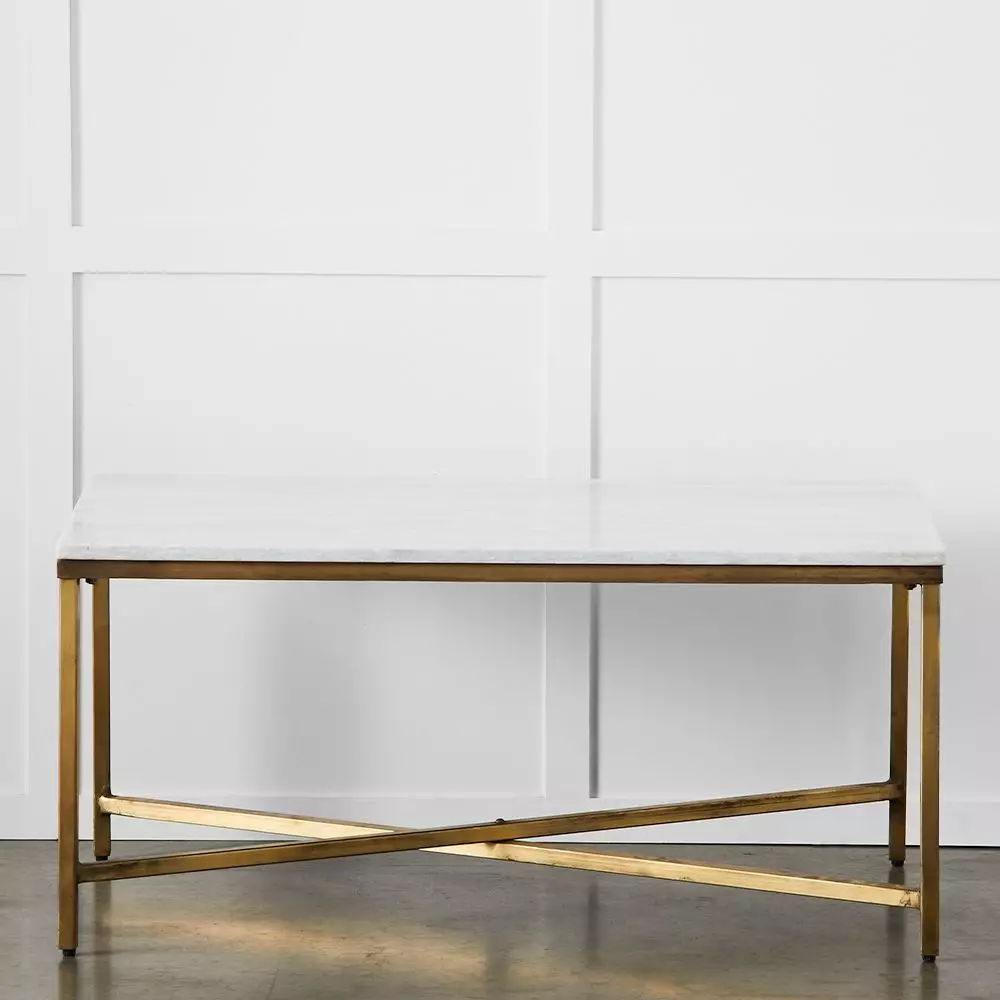 Bristol is a classic marble topped coffee table with brass plated iron legs. The slender crossed legs and open feel make it ideal for smaller spaces as it appears to float in a room. The classic colour combination of white and brass is versatile and elegant.