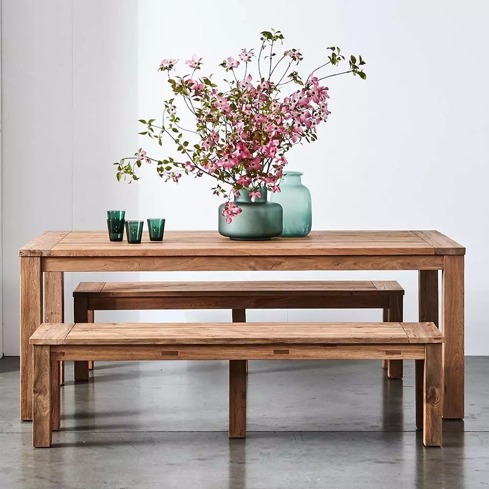 Outdoor dining and entertaining is easy with the Cabo table and bench set. A solid 200cm teak table is paired with two matching teak benches that tuck underneath the table when not needed. Leave them to the elements and let them turn a soft, weathered grey or protect them with teak oil to maintain the current hue.