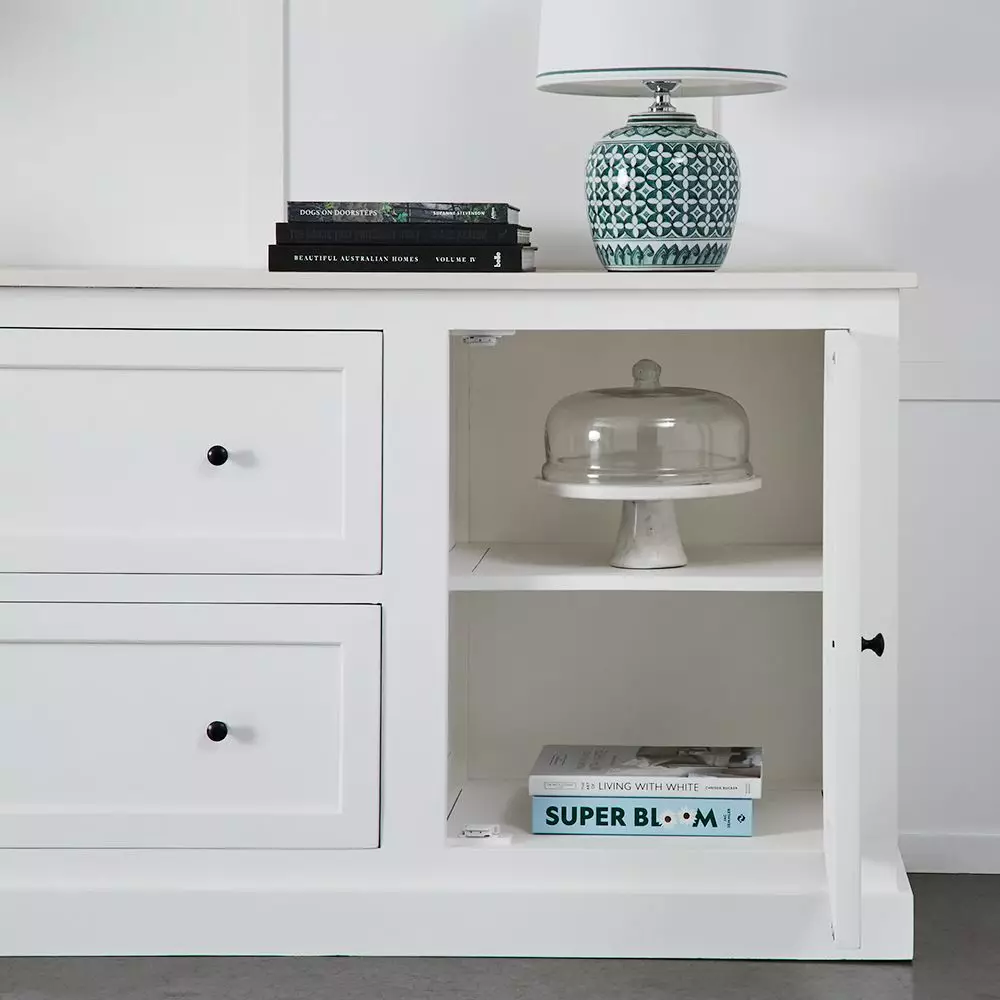 Superbly crafted and proportioned, it has two spacious drawers and two cupboards divided by a beautifully finished shelf that provide ample storage. The all-white Cotswold will look equally at home in a dining room, kitchen or living room.