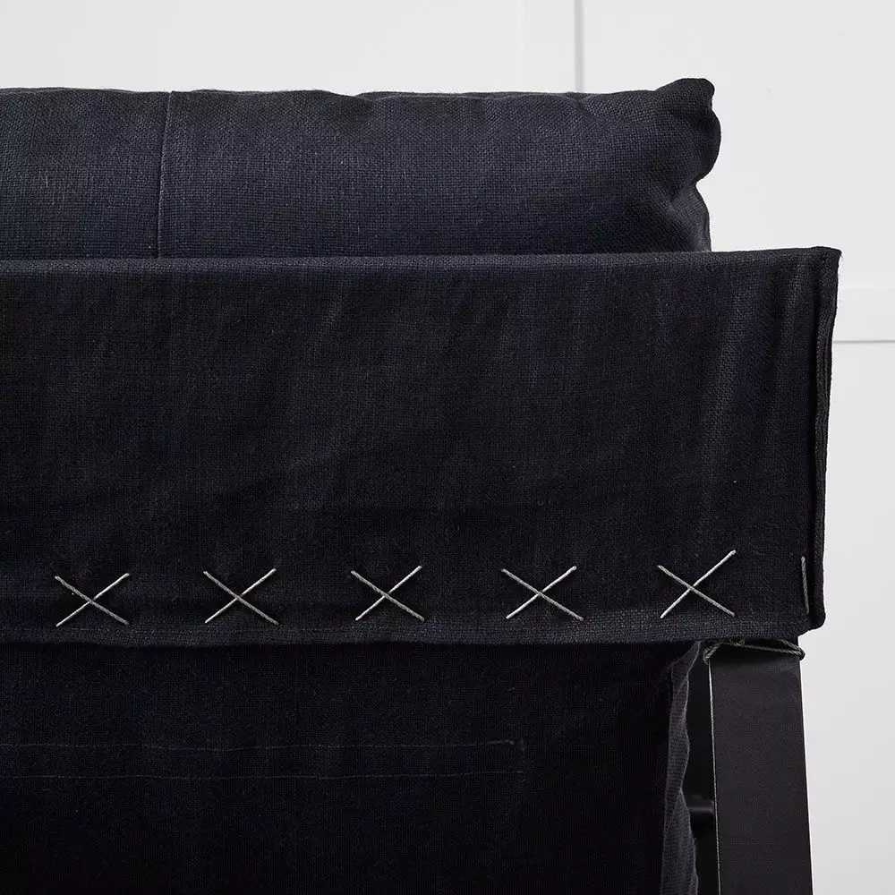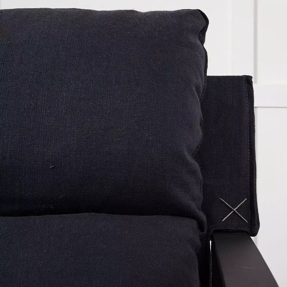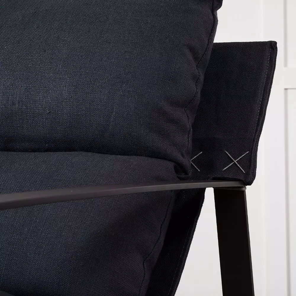 The Finch armchair is a beautiful combination of black iron and graphite linen. The iron frame is given a softer look with rounded corners and the hammock style seat with a padded cushion make it supremely comfortable.