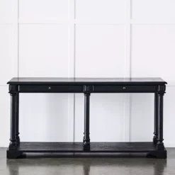 The Fitzroy cabinet is crafted from oak and washed in black so the grain is still apparent and part of the appeal of the piece. Two larger drawers each side of the cabinet are cleverly made to look more interesting with the suggestion of more drawers, and one middle drawer (perfect for hiding remote controls) and a long open shelf completes the storage options.