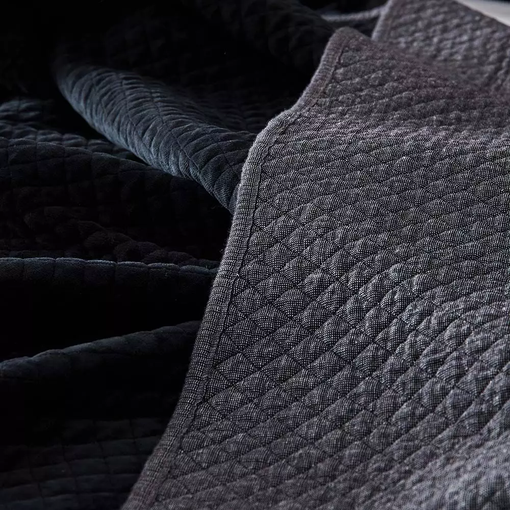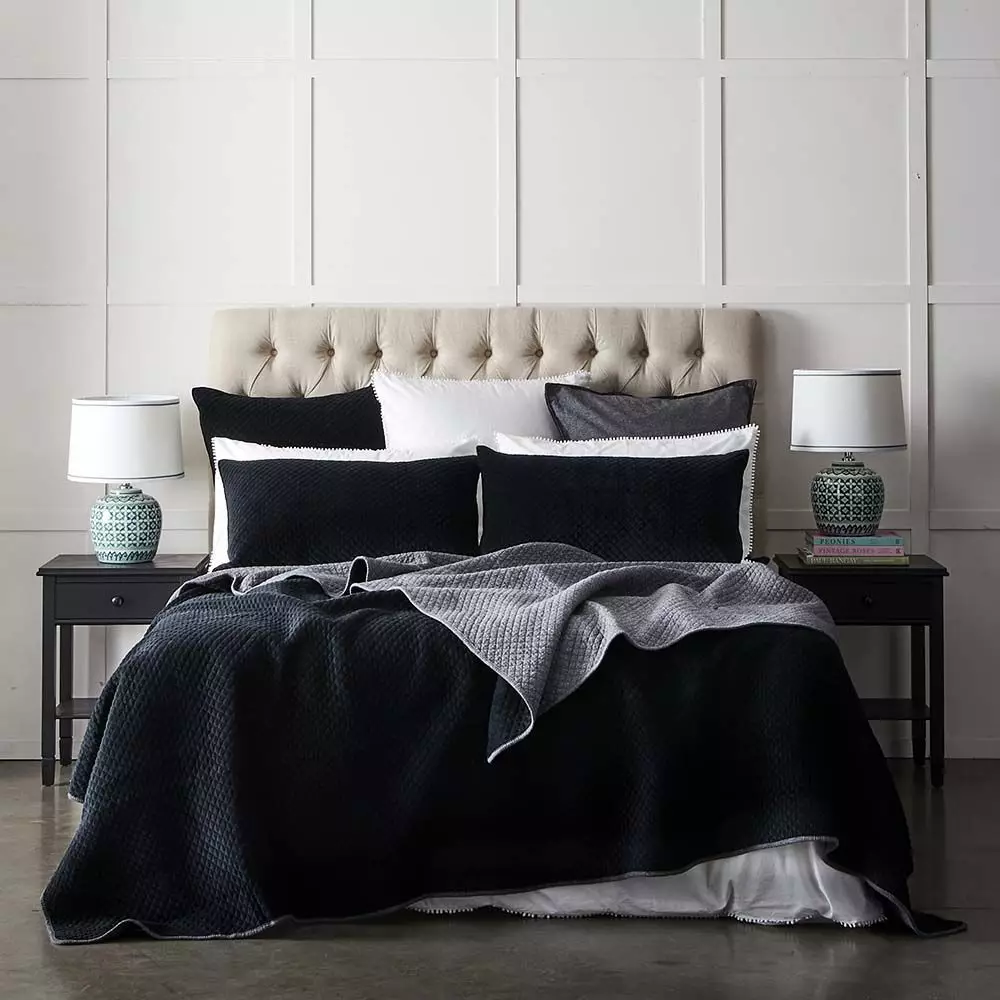 This luxurious black velvet coverlet is quilted in the traditional French boutis manner but is given a more modern look with diamond shaped embroidery and a black chambray fabric on the other side. The coverlet is reversible, so you have two looks from the same coverlet.