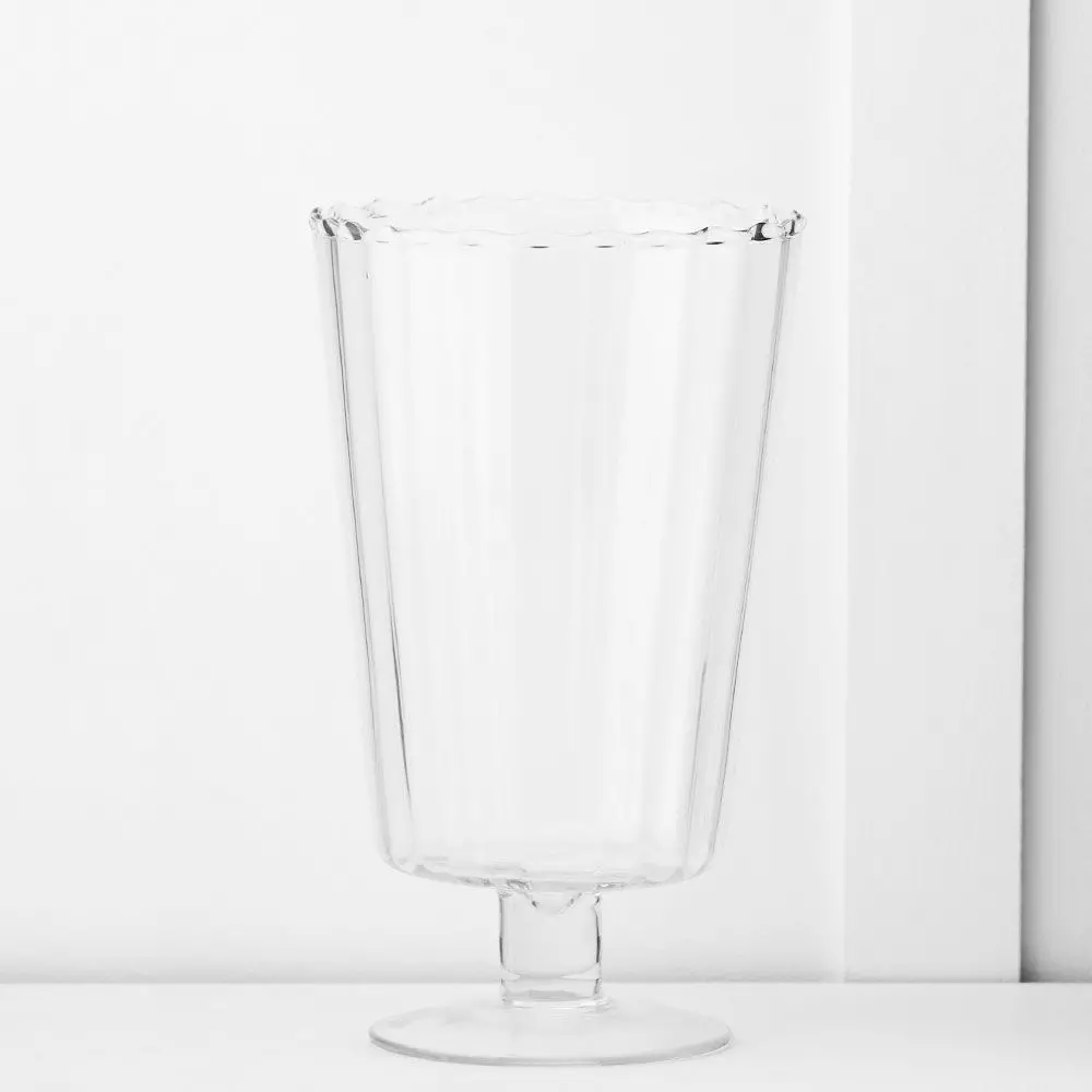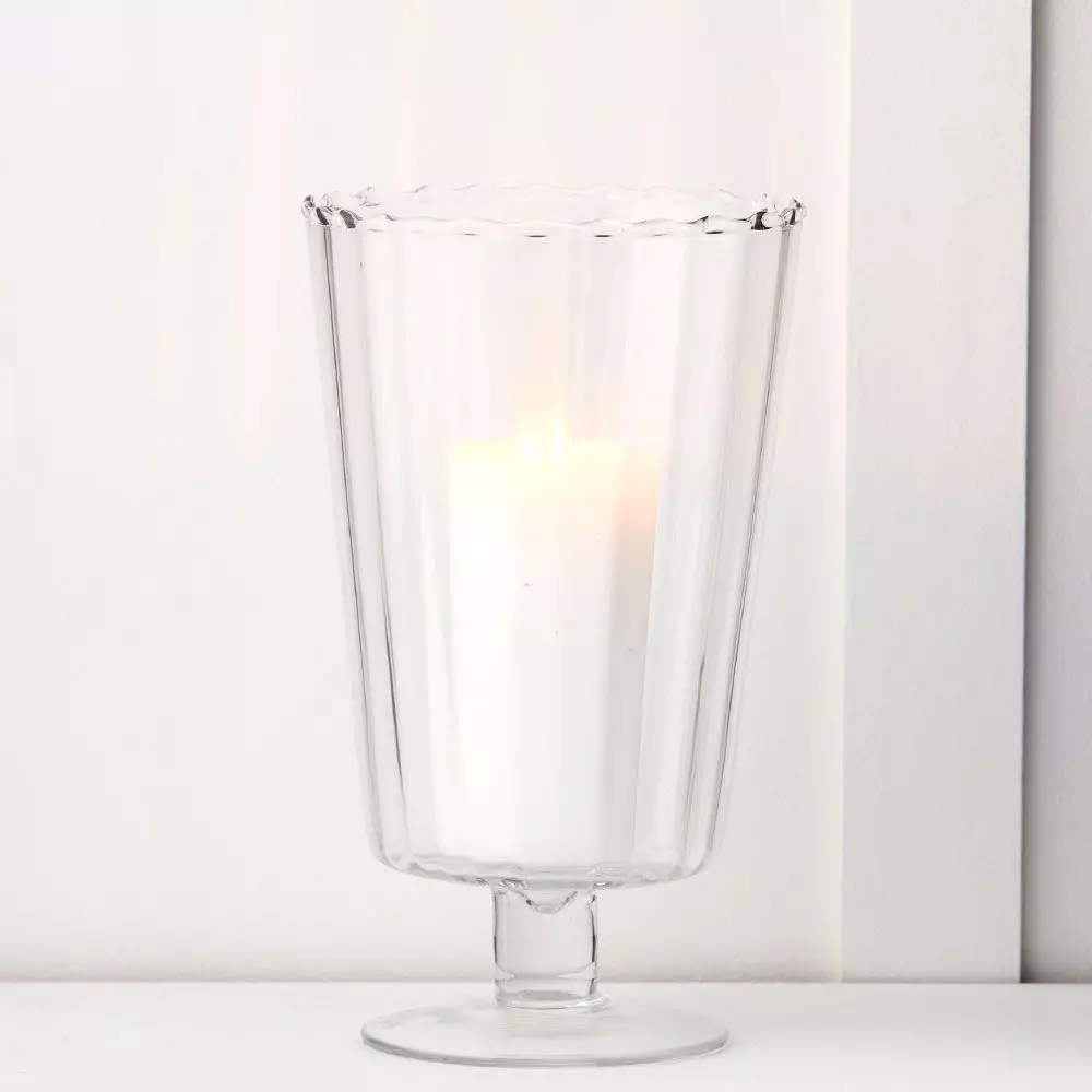A tall, fluted glass hurricane lamp which is the perfect size for our 12 cm pillar candle. Mix a few hurricane lamps in different sizes and shapes for a dazzling display.