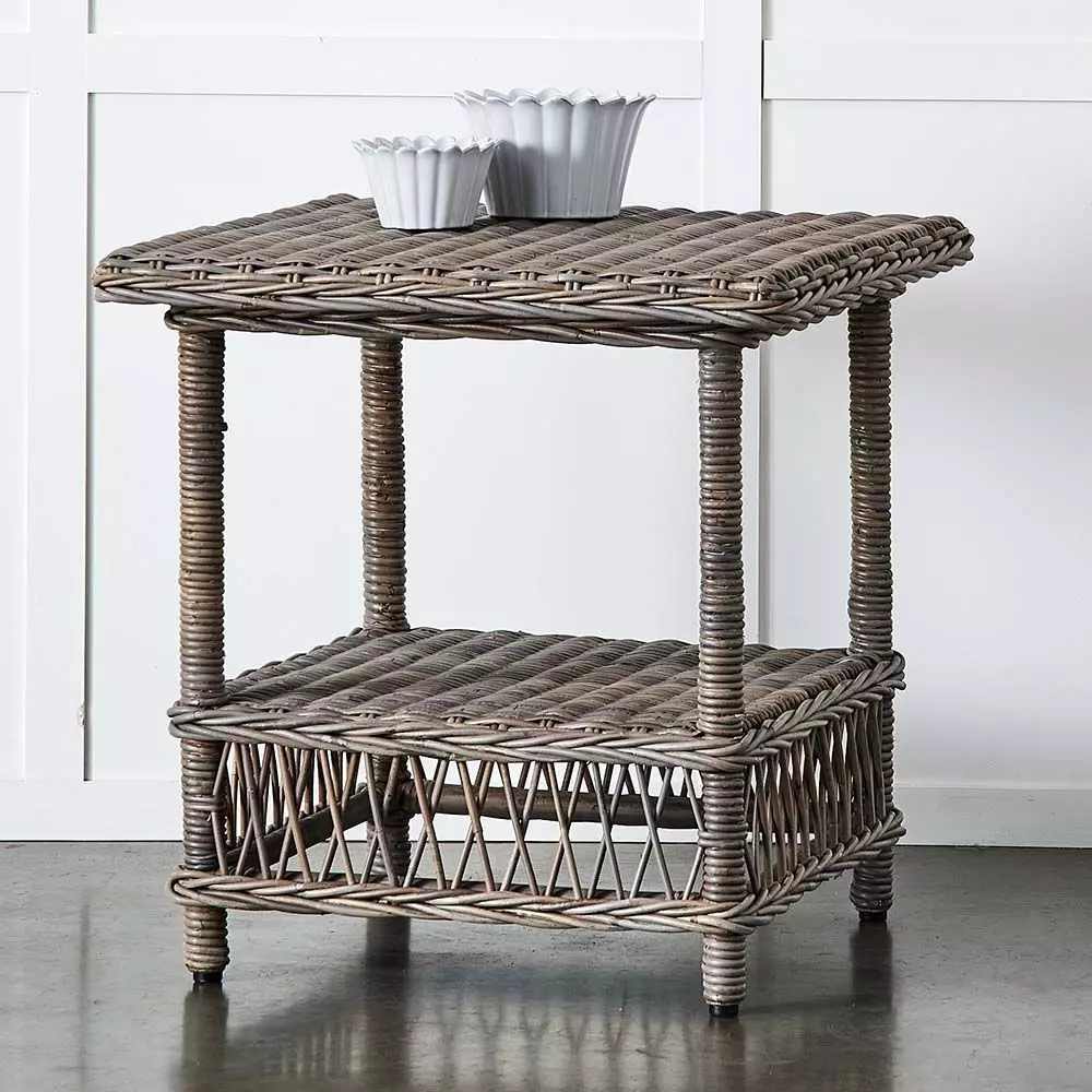 Your outdoor space will be even more comfortable with this beautifully rattan side table. The perfect companion with a table top and a shelf – settle in for the afternoon. Carefully woven from rattan with a delicate trim around the base, adding to its allure.