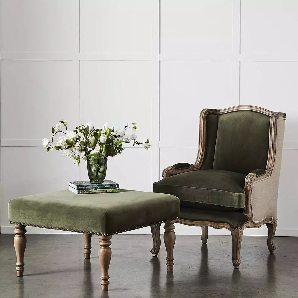 The Khadi ottoman is a versatile piece of furniture – it can be used as an ottoman or a coffee table. The legs are beautifully crafted from sustainable mango wood and left with a raw, natural finish. The top is upholstered in a luxurious velvet with brass studding and filled with quality foam and poly fibre. It will easily find a place in any room.
