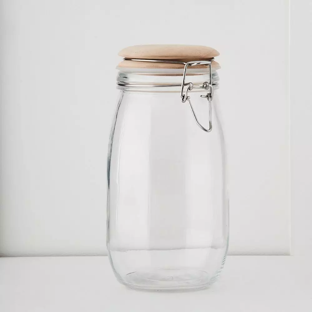 We love the simplicity of glass and natural wood. Our Larder range is the perfect way to store dry goods and keep them fresh. The beautiful character of the rubberwood lid ensures their uniqueness. The jar is dishwasher safe. Hand wash lid only, dry thoroughly. Regularly wipe with a light coat of food safe mineral oil/beeswax to preserve the character of the wood. Use with dry goods only. Stainless steel clip and natural rubberwood lid with silicon seal.