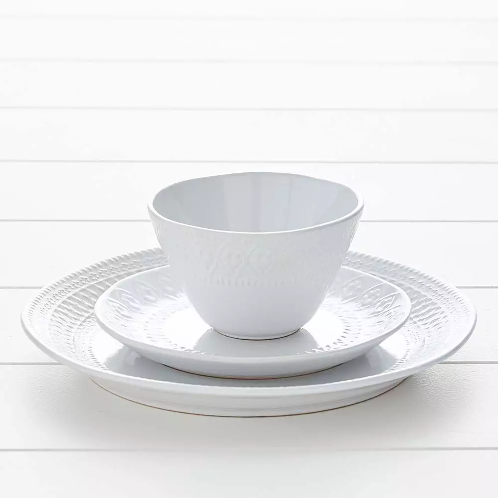 Our beautifully embossed stone crockery will add some stylish hues to your table. A range of plates, bowls, servingware, cups & saucers and mugs are available in duck egg, white and blush.