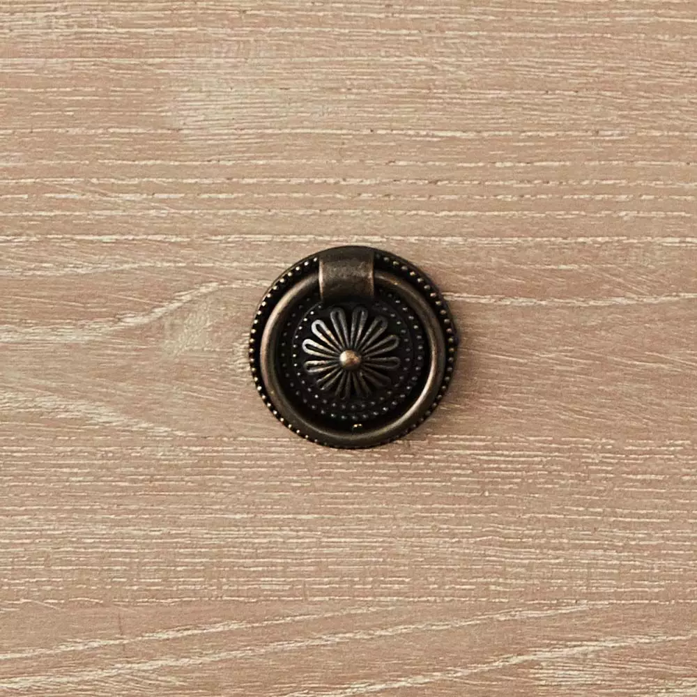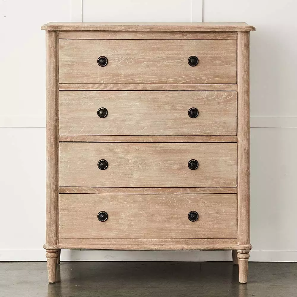 The Montrose has a curved front and slightly rounded edges on the top of the tall boy, lovely detailing on the legs and elegant metal ring pulls on the four drawers – all combine to create a charming piece of furniture. Crafted from reclaimed elm and fir.