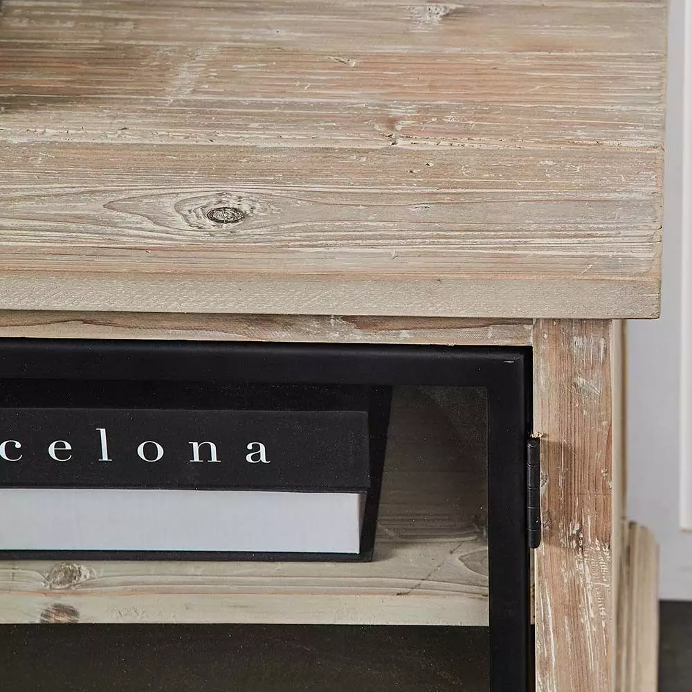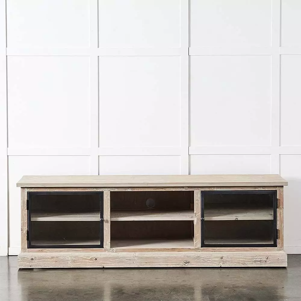 Handcrafted from reclaimed fir, this television unit has two glass doors to keep items safe and dust free. The two middle shelves provide ready access to often needed items. The signs of the previous life of the timber are still seen under the light wash, and add to the beauty of the piece.