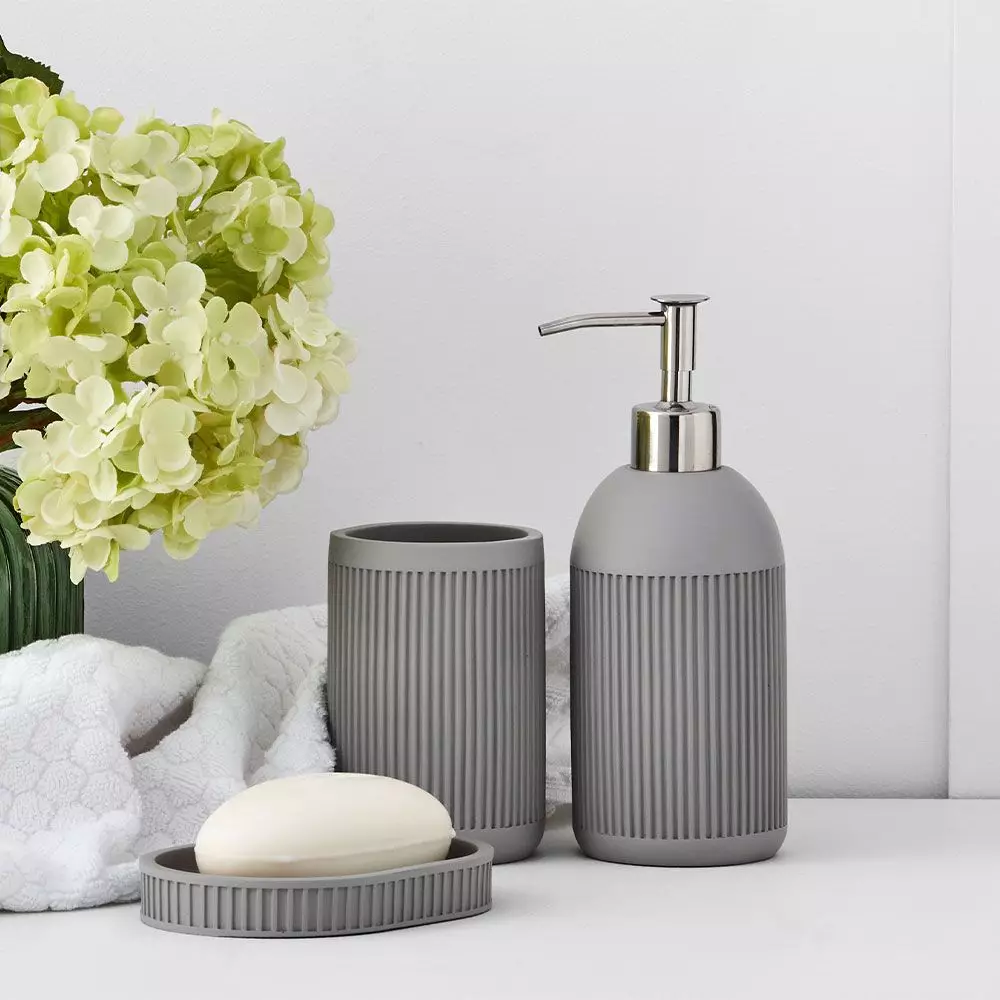This stylish range of soft dove grey bathroom accessories will take your bathroom to a five star retreat. Available in a cup, soap dish and a lotion dispenser.