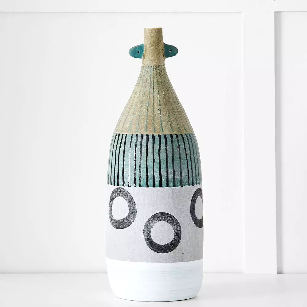 A beautifully decorated ceramic bottle in calming tones will look good by itself or pair it with the vase for added impact.