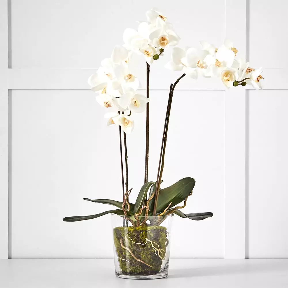 The Phalaenopsis orchid is a luxuriously delicate flower, this beautiful arrangement has 3 spikes in a simple glass vase. You’ll be able to enjoy it all year round in any room.