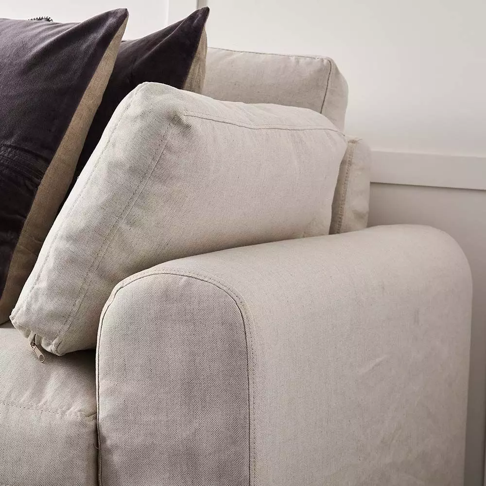 The lovely modular Rennes sofa comprises three pieces that clip together underneath so they don’t move apart. There are two armrests and three rectangular cushions.