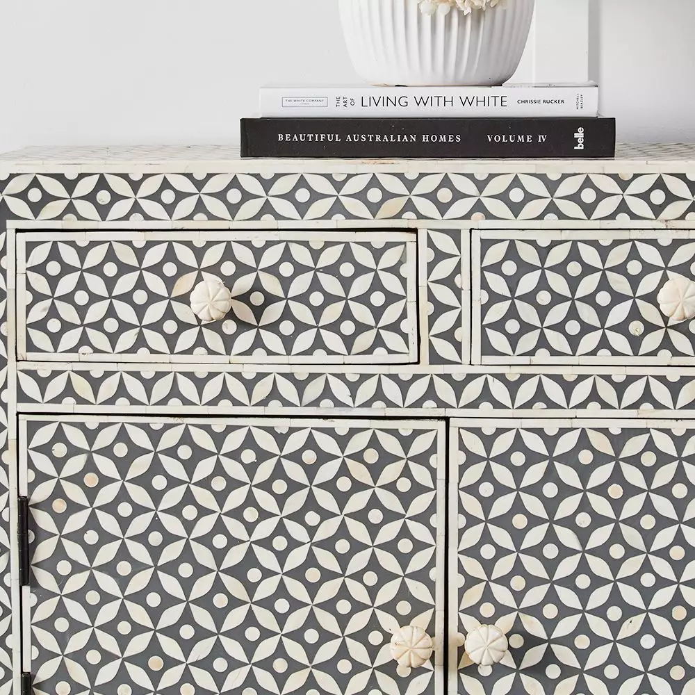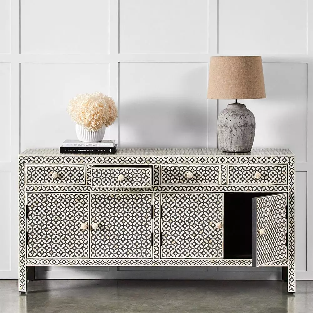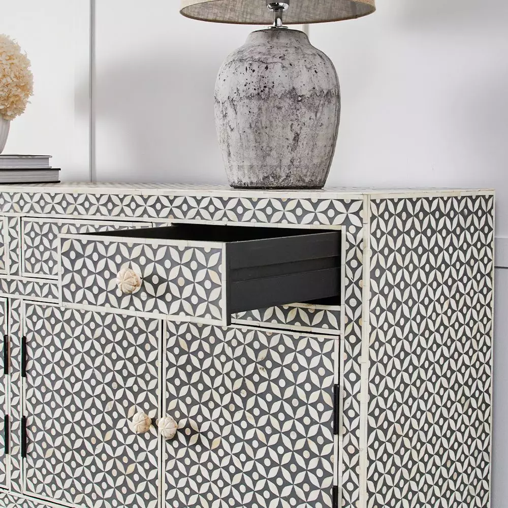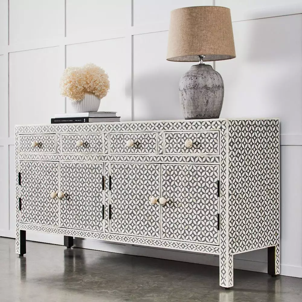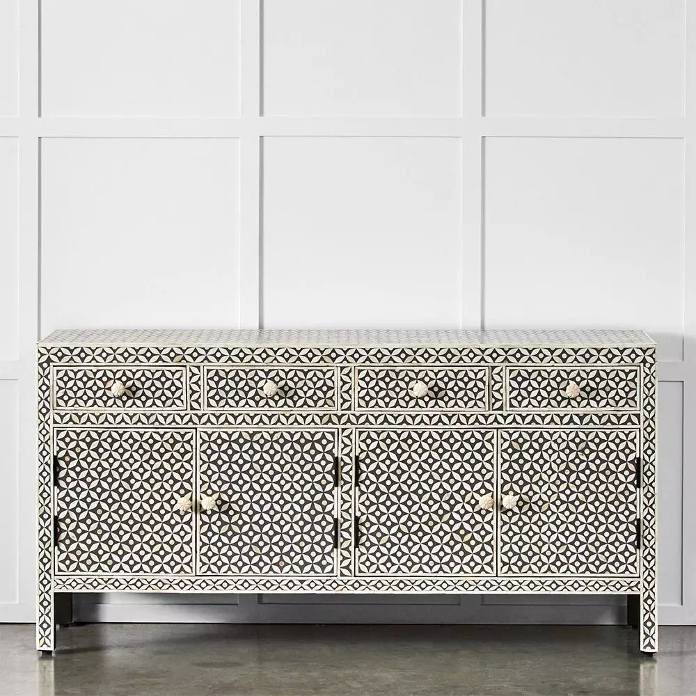 A striking sideboard crafted from ethically sourced bone and dove grey resin. The superb craftsmanship exemplifies skills passed through generations. Natural colour variations in bone and resin are normal, with patterns varying among artisans. With 4 drawers and 4 cupboards, it’s not only a beautiful piece of furniture – it’s practical too. An investment piece to be enjoyed for years to come.