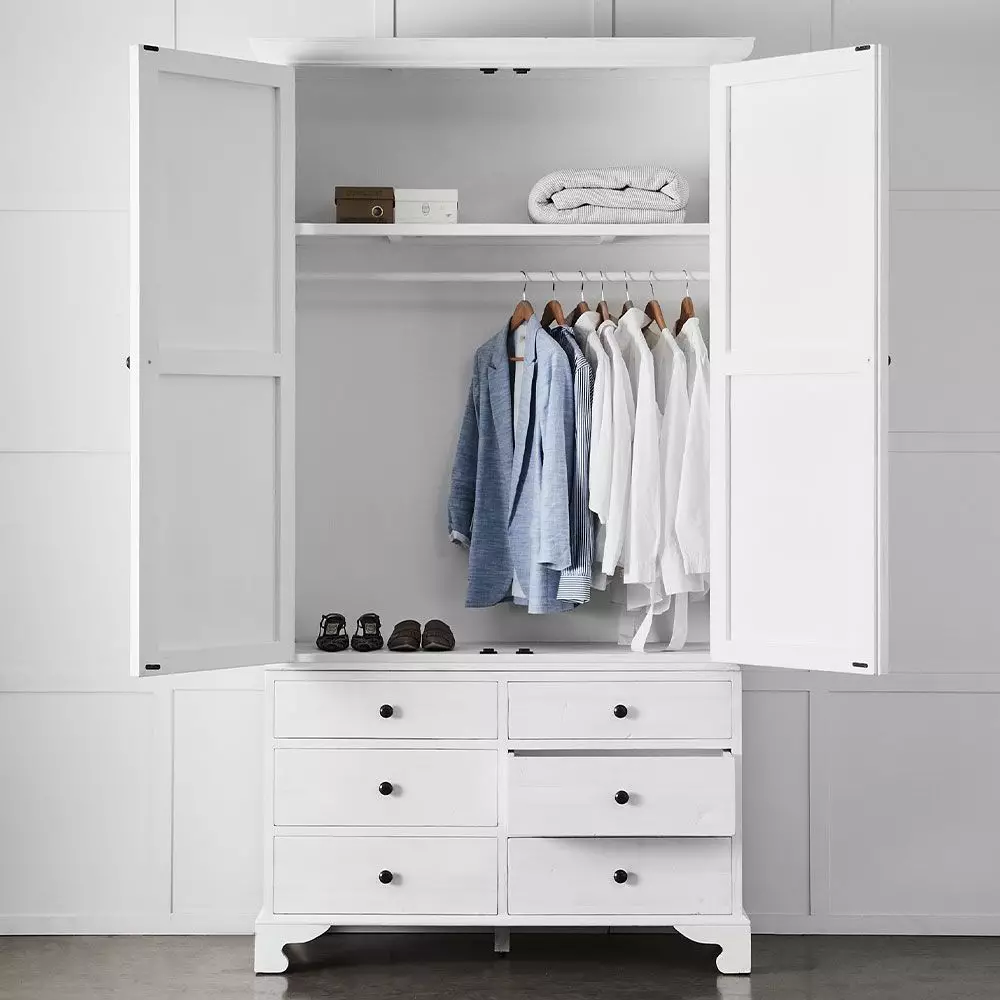 Crafted from recycled pine, the Roma wardrobe offers plenty of storage with one shelf and a hanging rail in the top and 6 roomy drawers in the bottom. The distressed black paint makes no attempt to camouflage any signs of the previous life of the timber. Constructed in 2 pieces for easier transportation.