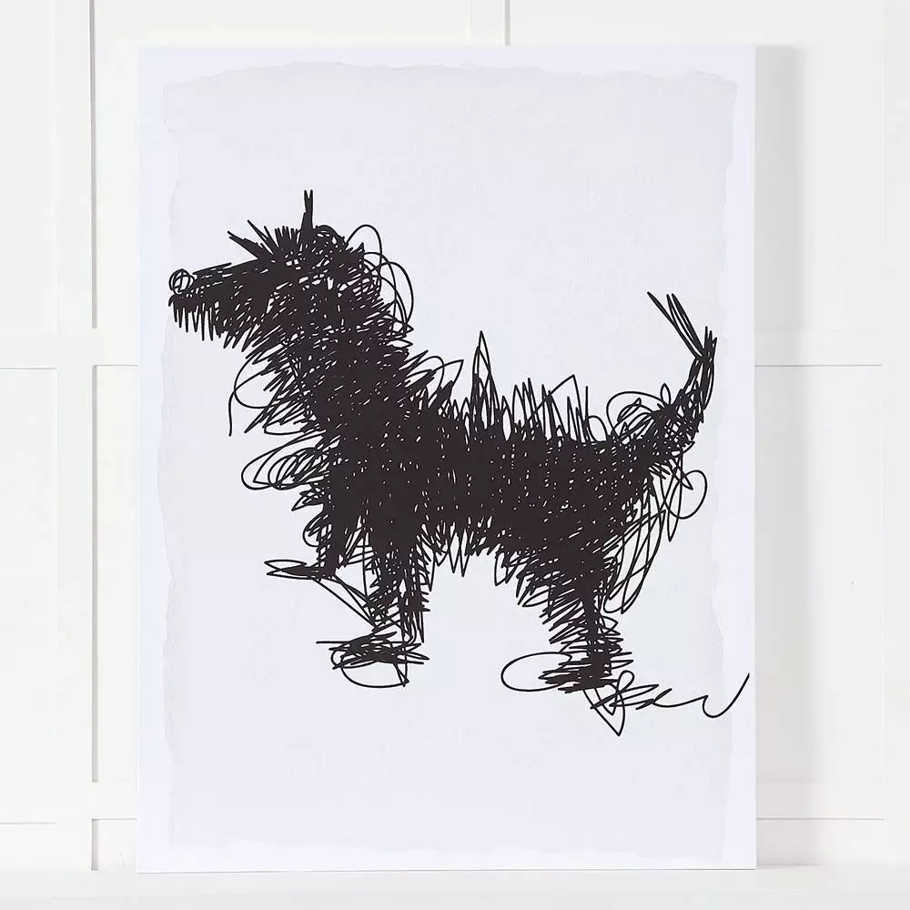 A playful black scribble drawing of Toto, the famous dog from the Wizard of Oz will look